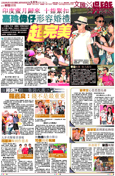 偉仔和嘉玲及好友林青霞昨日從印度新德里回港,偉仔和嘉玲約於十二時十五分十指緊扣地步出機場禁區,雙雙戴上墨鏡,嘉玲則穿上鬆身裙,左手戴有佛珠是一個印度高僧在她婚後送給她的。兩人見到大批記者等候表現合作,停下來讓記者拍照並接受訪問,當記者大叫「梁生梁太恭喜晒」時,他們都微笑點頭。