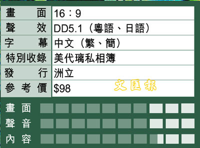不過,《美代璃之森》也有特別的地方,筆記一邊看,一邊記下精靈的名字:森林智者叫彌五爺爺、森林守衛叫波哥利、喜歡在人類家中閣樓居住的叫華士拉司,最深印象的是吸夢獸魔古利,能把人類的噩夢吸掉,也能把噩夢傳給壞人。雖然繪畫這些精靈的線條相當簡單,但反而更見童真。愈聽愈覺得美代璃的聲音柔和動聽,也「熟口熟面」,原來是由人氣爆登的蒼井優配音。喜歡CG的也不要錯過特別收錄中的「美代璃私相簿」,還有片尾曲時播放時的片段,映出了鄉村的春夏秋冬,可說是全片畫功最美的一幕。