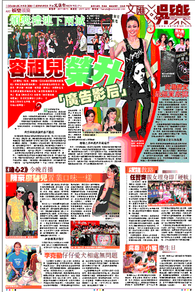 【本報訊】(記者 黃佩麗)《2008最受歡迎廣告頒獎禮》前晚在無線電視城舉行,出席嘉賓包括容祖兒、羅家良、商天娥、周汶錡、陸詩韻、趙碩之、林威辰等等,祖兒憑麥當勞的廣告成為「最受歡迎廣告女主角」,歌曲《陪我長大》也奪得「最受歡迎廣告歌曲」,祖兒笑言感到十分開心,尤其首次得到女主角獎,更令她心情興奮。