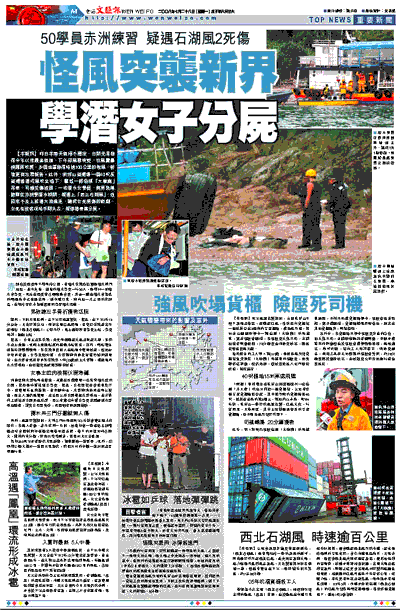 【本報訊】昨日本港天氣極不穩定,日間先是錄得今年以來最高氣溫,下午卻風雲突變,狂風雷暴挾驟雨吹襲,多個地區錄得時速100公里的強風,粉嶺更有冰雹報告。此外,流浮山貨櫃場一個40呎長貨櫃箱遭怪風吹至塌下,擊毀一部俗稱「大麻鷹」吊車,司機受傷被困;一名潛水女學員,與男教練隨隊在赤洲學潛水期間,疑遇上「西北石湖風」,致因來不及上船遭大浪捲走,釀成女死男傷的悲劇,女死者被發現時手腳失去,疑慘遭車葉分屍。