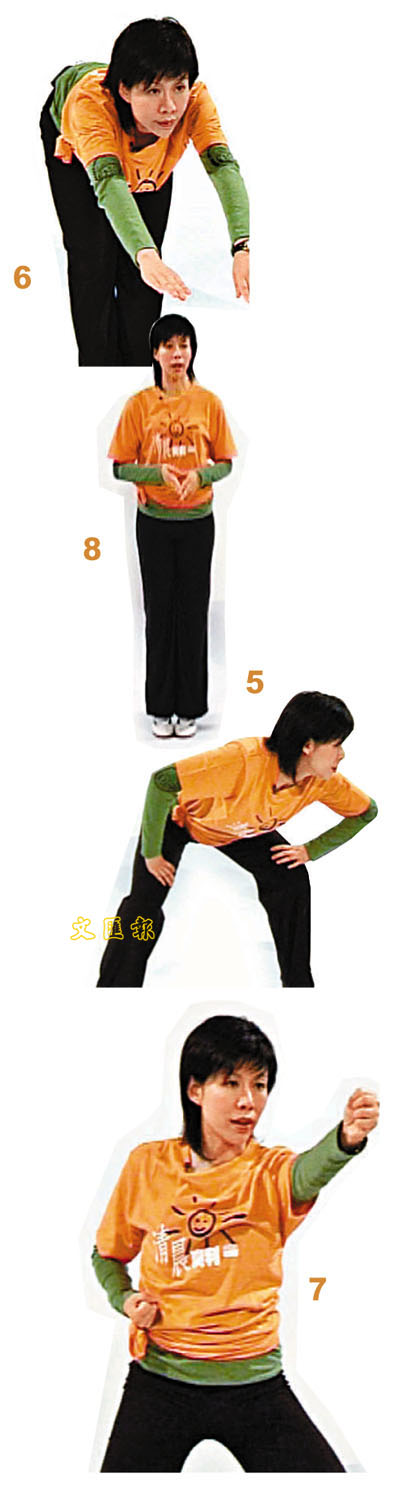 5.搖頭擺尾去心火:先開步,開步步形要大,兩手打開向上托,然後向下放大腿上。上半身由左至右向前俯身,左右交替,最後慢慢轉頭。這動作有助去心火。初練習時腿可能會比較累,頭要向上頂,動作需要慢而幅度要大,身體亦要保持中直。