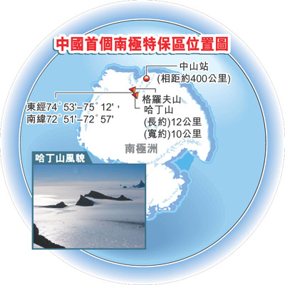 【本報訊】據中新網29日電:據《中國海洋報》報道,在不久前召開的第31屆南極條約協商會議上,中國提出的格羅夫山哈丁山南極特別保護區管理計劃獲批准,這是中國設立的第一個南極特別保護區。該保護區位於格羅夫山中部的哈丁山一帶(東經74°53'~75°12',南緯72°51'~72°57'),長約12公里,寬約10公里,呈不規則四邊形。該區域距離中山站約400公里,為北北東-南南西向、島鏈狀分佈的冰原島峰構成的山脊縱谷地貌。該區域保留著冰蓋表面升降遺蹟,分佈著自然界罕見的、極易被破壞的典型冰蝕地貌與風蝕地貌。