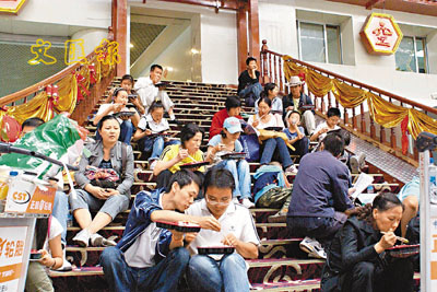 ■滯留乘客坐在候機樓的一處台階上吃盒飯。本報駐雲南記者黃珺珺 攝