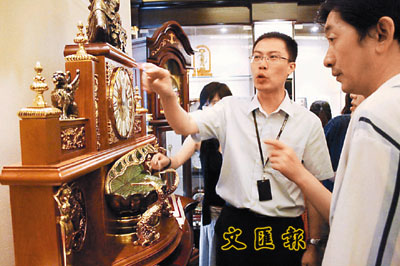 ■一眾參觀者圍觀一台售價38萬的英國哈丁古典計時鐘。 本報記者武毅田 攝