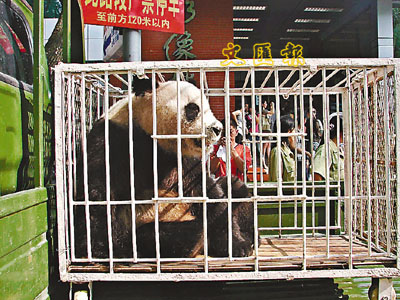 ■熊貓在籠內等待體檢。本報實習記者林婷 攝