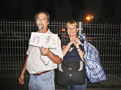【本報北京新聞中心記者江鑫嫻、實習記者張一墨、趙一存30日電】綵排前,本報記者在鳥巢外看到,那些擁有綵排門票的人會引來旁人強烈的羡慕,老外亦不例外。來自美國得克薩斯州的ROME夫婦(圖)更將羡慕付諸於行動,手舉寫著兩個巨大漢字「門票」的牌子,圍著鳥巢不停繞圈,希望能有人出讓門票,ROME先生表示,願出100美元(約780港幣)購票。看到本報記者,ROME夫婦二人立即走上前請求記者教他們漢語的「我想買門票」怎麼說,之後就一直反覆練習並高聲大喊,急切心情溢於言表。他們說,從1992年巴塞羅那奧運會開始,二人逢奧運必看,惟有今次任何一張門票都沒買到,深感遺憾。
