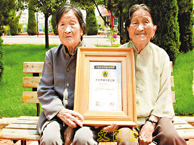 據《齊魯晚報》報道,日前山東省一對孿生姐妹趙秀香、趙秀菊(見圖)收到了上海健力士總部寄來的「年齡最大雙胞胎」證書,被確認為中國年齡最大的雙胞胎。這對雙胞胎姐妹1912年5月18日出生於山東省乳山市,年齡為「96歲又兩個月」。兩人雖已近百歲,但生活仍能自理,思維也非常清晰,聊起幾十年前的往事如數家珍。 ■本報駐山東記者 于永傑、實習記者 譚新道