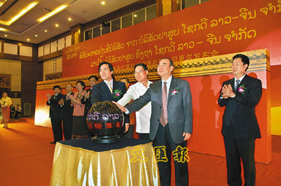 ■老撾工業貿易部部長南·維雅吉(中)、中國駐老撾大使潘廣學(右)、中國煙草國際有限公司副總經理郭勝鎖(左)為新公司揭幕。