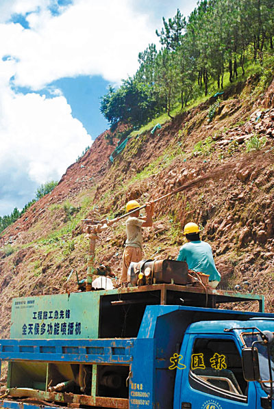 「簡單點說,就是先將陡坡用鐵絲網罩住,然後往上面噴灑含有草種的泥水,用不了多久,密密麻麻的小草就長出來了。」