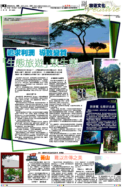 「愈來愈多的生態旅遊達不到『甚麼都不取,甚麼都不留』的初衷。這可說是玩世不恭的『漂染』(greenwashing,綠色和白塗料的混合詞),有如將一片森林的影像,放在一瓶有毒的化學物質裡。口裡宣傳環境保護,實際上是背道而馳。」