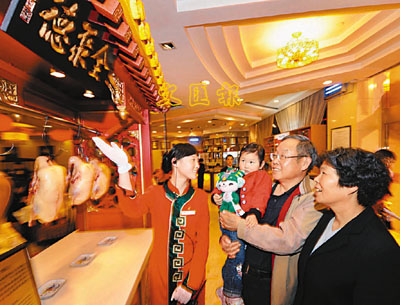 清同治年間1864年,「便宜坊」的買賣興隆,燜爐烤鴨供不應求。全聚德的創始人楊全仁,原本賣生雞生鴨,用烤小豬的方法發明了烤鴨子,因而有了全聚德掛爐烤鴨。全聚德將待烤的鴨子吹鼓,灌入清水,再將鴨子掛入爐內火烤。外烤內煮的鴨子,肥大鮮嫩,極引食慾。全聚德的掛爐烤鴨「看得見摸得著」,為食客帶來了全新店堂視覺。
