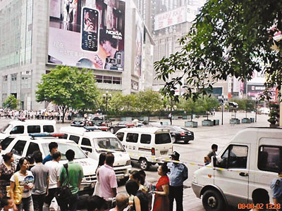 ■警方在重百大樓四周拉起一圈警戒線。本報駐重慶記者許星 攝
