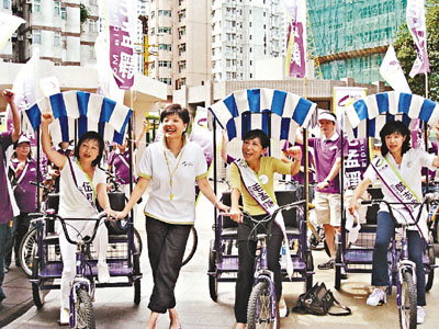 ■公民黨毛孟靜昨日踩三輪車巡遊九龍西拉票。 本報記者張文豪 攝