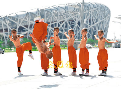 8月3日,來自北京元鴻武術學校的小學員來到奧林匹克中心區演練,展示他們各自的武術絕活。據了解,奧運期間,「少林小子」將為中外來賓獻上精彩紛呈的少林武術展演。 新華社