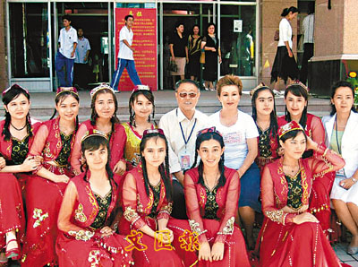 ■2005年在新疆作報告後,李佩成與中學師生合影。
