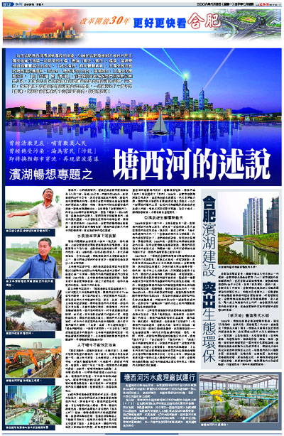 今年7月,上海城市建設設計院合肥濱湖新區塘西河治理方案出台,秉承「集成創新、因地制宜、生態和諧」的理念,塘西河治理將堅持水系治理、截污治污、調水補水、監控調度、生態重建「五管齊下」,沿塘西河打造防護林、合肥新天地、城市公共綠地、城市中央公園、濕地公園5個景觀帶。並將運用生態——生物修復技術,對河水污染物進行轉移、轉化、降解。同時,根據沿河周邊結構功能劃分的不同,選用「親水平台」、「景石駁岸」、「親水休閒」、「濕地」等不同斷面結構形式,計劃在河邊設置一定數量的遊船碼頭,開發水上遊覽項目。塘西河將與巢湖、十五里河共同打造合肥濱湖新區湖光翠影的生態濕地岸線及水岸交融的動態濱水空間。今年上半年,濱湖新區完成不讓一滴污水流入塘西河的任務。目前,合肥濱湖新區啟動區1.98公里河道治理工程已基本完工,塘西河水岸雛形業已顯露。
