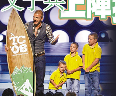 以一身醒目消閒便服上台的碧咸,領取滑浪板型獎座時身旁還有三名寶貝仔布魯克林、羅密歐和告魯斯,一家四口都剪成清爽怡人超短髮,尤其小孩們略帶害羞地望著父親發言,台下觀眾都看得非常開心。而在這個盛大場合,幼子告魯斯再次發揮新萬人迷本色,眾目睽睽下大跳搞笑霹靂舞,兩三下子連父親的風頭都搶去,甚有機會成為美國演藝圈最有前途的童星。據知約三分二的投票者,都有選碧咸是本年度最出色的男運動員,把強勁對手像高比拜仁等大舉拋離,讓他自英國後同時受到美國年輕一輩的支持。所以當地最高銷量的男性刊物《Men's Health》,都把前英格蘭隊長放到今期的封面和封底,那身魅力十足復古裝扮,在拳擊擂台上流露出足球以外的截然不同味道。