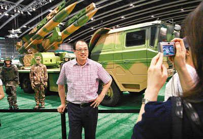 ■林大輝在地對空導彈發射車前留影。本報記者潘政祁 攝