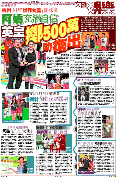 阿嬌薄施粉黛主持開球禮,自信地走進球場,手持籃球的她神態自然,風采依舊,似乎已完全準備好面對觀眾,阿嬌今次是應世界籃球聯會邀請為「世界女子鑽石籃球大賽」主持開球禮,儀式在晚上7時舉行,世界籃球聯會會長BobElphinston委任她為宣傳大使。「英皇星藝」內地演員白冰亦獲邀出席,而關智斌、鄭希怡(Yumiko)則擔任表演嘉賓。