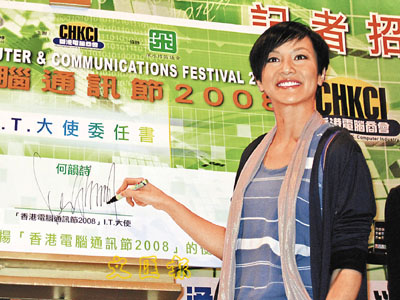 【本報訊】(記者 梁靜儀)昨日出席「香港電腦通訊節2008」記者會,會上被委任為「I.T.大使」,並即場進行簽署委任書儀式。阿詩表示身為「I.T.大使」對電腦也有一定的認識,不致於是白癡,平日也會用來寫blog及寫歌,特別在寫歌時可以即時與其他人交流及即時傳送歌詞最為方便。她表示自己的錄音室已經運作,很多時也會留在錄音室寫歌,免得自己心散。問到她可有接外來的生意?阿詩答道:「沒有呀,現時最大客仔還是自己,不過陳奕迅、at 17及方大同都有來錄音,因為我有一部貴琴,堪稱是現時全港最靚聲的。」
