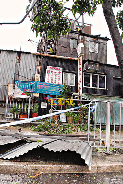遭「北冕」吹毀的木屋,位於茶果嶺道99號,是一棟3層高的鋅鐵木屋,3樓住有姓周4母子,前晚打風期間,僅周太與兩子女在家。