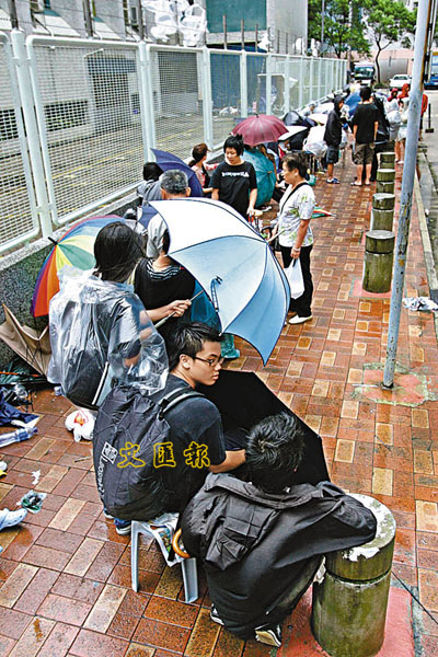 【本報訊】(記者 歐陽杏櫻) 颱風「北冕」昨早橫掃本港,在8號風球下,打亂近3萬名會考生「撲」中六學位的計劃。教育局昨晨已宣布,中六收生程序順延至今日,但為爭奪全港僅剩的2,000多個學額,數百名考生及家長仍分別於多所學校門外通宵排隊,他們不滿學校未有及早安排派籌,令其要冒狂風暴雨在校門外苦候。及後學校為有關學生登記資料,今早再派發申請表。