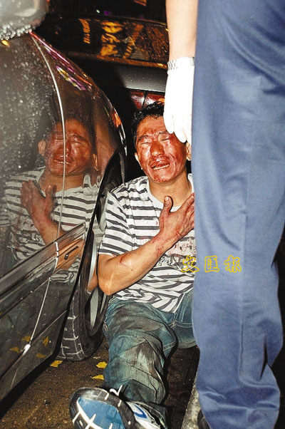 ■在佐敦道遇襲受傷的尼泊爾籍男子滿面披血,狀甚痛苦。