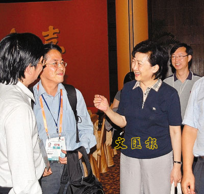 ■國務院港澳辦副主任華健與明報副總編輯劉進圖親切交談。