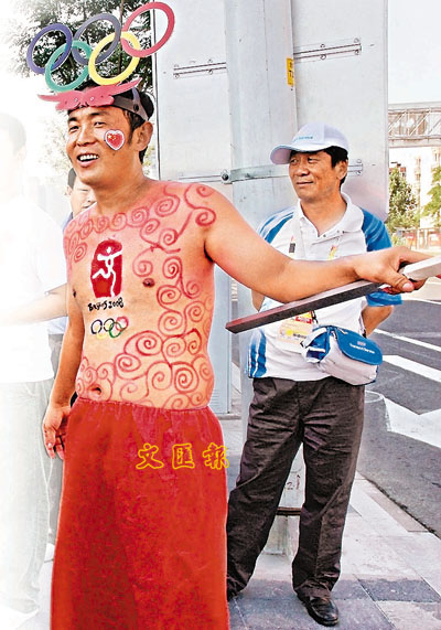 【本報北京新聞中心記者馬靜6日電】訪京團在奧林匹克中心區參觀時偶遇一來自河南的「火炬人」。該「火炬人」赤裸上身,頭戴五環標誌,以身體裝扮成出祥雲「火炬」形象。
