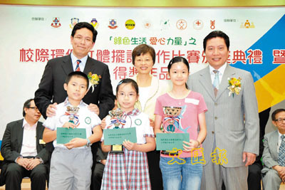【本報訊】由東華三院、保良局、九龍樂善堂、博愛醫院、嗇色園、香港佛教聯合會、道教青松觀、圓玄學院、仁濟醫院及仁愛堂攜手主辦,民政事務總署協辦的「綠色生活 愛心力量」社區及環境關懷活動,日前於奧海城二期主題中庭舉行其中一項活動「校際環保立體擺設創作比賽」頒獎禮暨得獎作品展,民政事務總署署長陳甘美華主禮。