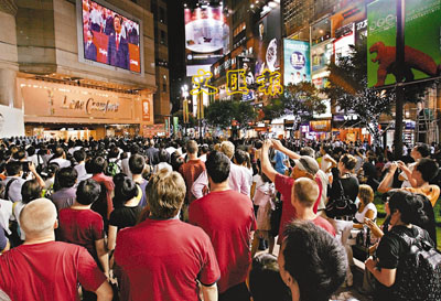 奧運氣氛濃罩香江,昨晚多個有電視大熒幕的商場都擠滿群眾,擠得水洩不通。在銅鑼灣時代廣場愈接近晚上8時08分的開幕式,就有愈來愈多市民駐足欣賞,無論行人路或馬路都擁滿人潮。當煙火在北京綻放時,市民讚嘆場面壯觀;電視畫面出現國家和香港特區的運動員時,全場人表現興奮,拍手歡呼。