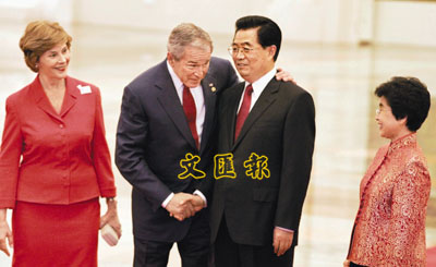■8日中午,國家主席胡錦濤和夫人劉永清在北京人民大會堂為出席京奧的貴賓舉行歡迎宴會。圖為胡錦濤夫婦歡迎美國總統布什夫婦,小布攬肩握手,盡顯老友情誼。 路透社