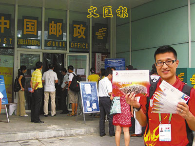 ■買到開幕式紀念郵品的記者興奮地展示。