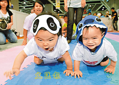 「全港嬰兒爬行比賽」一向吸引很多造型可愛的BB。適逢北京奧運,有媽媽親手縫製印有奧運五環的猴子裝,希望可奪得全場最得意造型的獎項。比賽一開始,一隻隻「小猴」、「小馬」、「小豬」、「獅子」、「小象」等「動物」被媽媽手中的電話或玩具吸引,齊齊爬向終點。但有部分BB中途竟停下來「觀賞」對手比賽,亦有BB被現場熾熱的氣氛嚇得大哭,在起點停留。更有裝扮可愛的BB竟然只顧看著攝影師的鏡頭「擺pose」,忘了自己正在比賽。 ■本報記者李志樑 攝