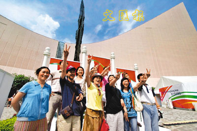 ■參加「香港奧運馬術觀戰團」的內地旅客昨日到港,先到尖沙咀的「奧林匹克廣場」參觀,感受奧運氣氛;下午5時他們再到沙田主場館,觀看奧馬比賽項目。 本報記者曾慶威 攝
