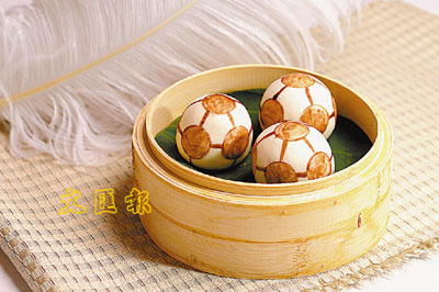 ■「足球小將」這款點心是在傳統的蓮蓉包上,灑上朱古力粉印上足球圖案。