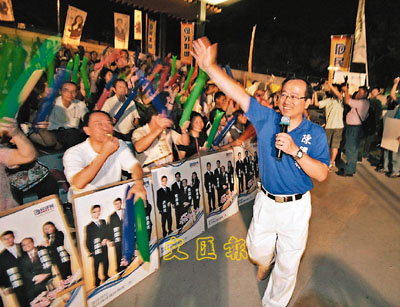 全力以赴 「全家總動員,投票民建聯!」「選議員,要選民建聯!」逾600名九龍東的市民昨日齊集黃大仙摩士公園,為以陳鑑林為首的民建聯4人團隊,繼續加油注入能量。在真情對話環節中,團隊成員黎榮浩坦言,民建聯九東團隊必須得到市民支持,才能突破3個攔在面前的「關卡」︰一,打白鴿(民主黨);二,揭開「扮公道」黨(公民黨)的真面目;三是要過「粗口黨(社民連)」。陳鑑林強調,雖然民調顯示他們的團隊應可取得1席,但選戰不容有絲毫怠慢,希望市民全力支持,最終可與工聯會的黃國健團隊一同勝出。