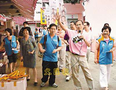 「大師父」曾鈺成無懼夏日炎炎,親率隊友鍾樹根、張國鈞、陳學鋒及郭偉強,穿梭區內大街小巷,公園及街市也不放過。出名口齒伶俐的阿曾不單手執「咪高峰」拉票,還經常向街坊賣口乖,尊稱長者做「哥哥姐姐」,遇上貼著民建聯團隊海報的檔主,又連聲多謝支持,祝大家「好生意」,逗得街坊樂開懷。有老街坊見阿曾的團隊非常落力,也回贈他們定心丸,「幾十年街坊了,當然支持你們,呢區7成街坊都會投民建聯呀!」