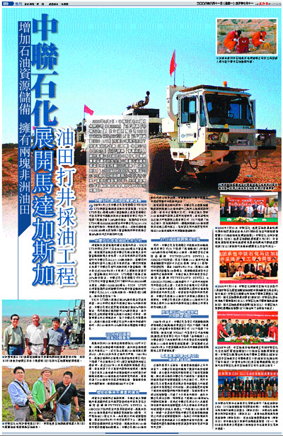 另外,中聯石化全資附屬公司馬達加斯加能源國際有限公司(以下簡稱「馬國能源」)所擁有100%股份權益的馬國3113油田,經國際著名石油評估機構 NETHERLAND SEWELL & ASSOCIATES評估,作出了馬國 3113 油田的石油蘊藏儲量保守估計不少於20 億桶(折合 2.7 億噸)的評估結論。截至 2008年5月31日止,馬國3113油田的現狀估值為105億港元。馬國能源在委託中石油遼河石油勘探局、中國石油大學和國際著名石油評估機構NETHERLAND SEWELL & ASSOCIATES對3113油田進行了一系列的開發研究和評估工作之後,又委託中石油東方公司承包了3113油田的重磁力、地震勘探工程和石油區塊勘探成果的研究工作,取得重要的勘探和研究成果。中聯石化馬國3113油田打井採油工程經已全面展開,中聯石化現正致力實施3113油田的打井採油工程和2104油田的勘探開發工程施工和項目研究相關工作。