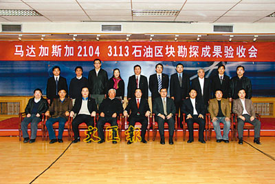 ■中聯石化與中石油東方公司聯合舉行「馬達加斯加2104、3113油田物探資料成果驗收會」,中聯石化榮譽主席兼執行董事王濤博士(前排左四),中聯石化董事會主席許智明博士(前排左五),香港中華煤氣陳永堅常務董事(前排右四),延長石油張積耀總經理(前排左三)和中國石油大學副校長龐雄奇教授(左一)等60多位專家和工程技術人員相聚在中石油東方公司涿州總部。