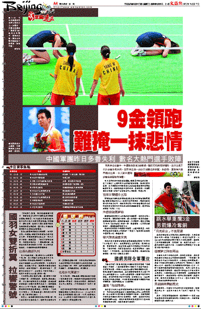 京奧昨日比賽中,中國隊先後有3金進帳。雖然仍在獎牌榜領跑,但亦出現了不少的意外和失利。世界排名第一的女子羽雙名將折翼,朱啟南、晏紫等大熱門爆冷出局,令人對中國隊的奪金勢頭有所擔憂。