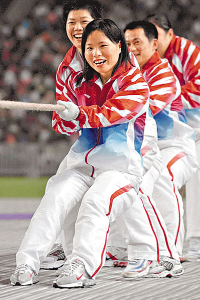 ■04年陳艷青作為奧運金牌精英訪港,在匯演中與香港武術隊現場拔河。新華社