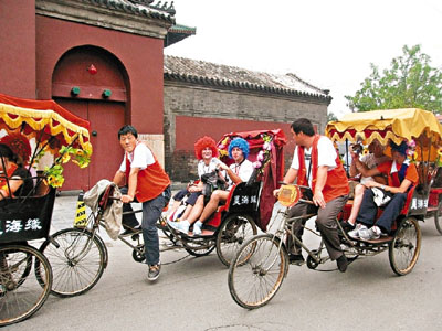 ■8月11日,一支由法國遊客組成的奧運啦啦隊亮相北京鼓樓前,乘坐三輪車遊胡同。 中新社