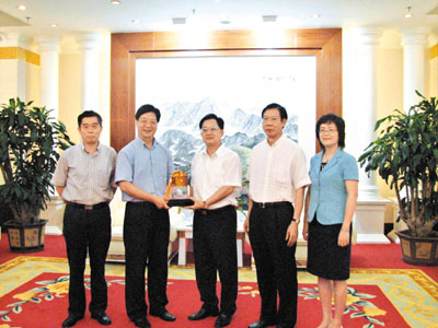 ■潮州市委書記駱文智(中),市委副書記、市長湯錫坤(右二),市委常委、宣傳部長陳麗文(右一)與本報副社長王樹成(左二)、社長助理王陶合照。 本報潮州傳真