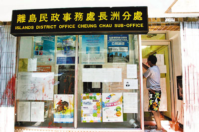 【本報訊】歹徒蓄意向政府挑戰!奧運敏感時刻,長洲民政事務處及郵政局,於昨凌晨先後遭破壞,大門及牆身被人潑以紅漆弄污,警方相信事件為同一幫匪徒所為,由於兩個部門事前未接到恐嚇及警告,警方正循多方面展開追查,案件同列作刑事毀壞案。