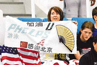 ■一位觀眾在「水立方」舉起「加油菲比斯,感謝北京」的橫幅。 新華社