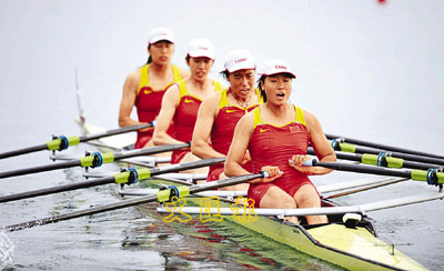 在進入最後500米衝刺時,中國隊更是加快槳頻,不過此時,英國隊也逐漸將速度加快,一度將優勢保持在近半條艇身的距離,不過,中國隊的4位姑娘並沒有因此放棄,在最後200米階段趕上英國隊,並第一個衝過終點。