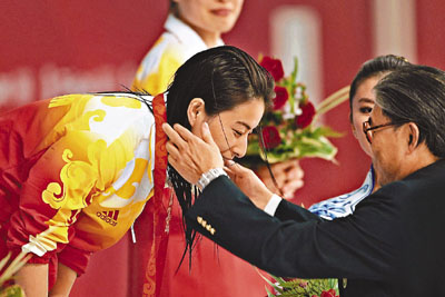 ■霍震霆為郭晶晶頒發金牌。 中新社
