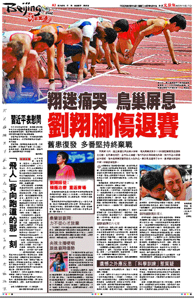 京奧第10天,爆出開賽以來的最大新聞:雅典奧運會男子110米欄冠軍劉翔因傷退出比賽。由於事發突然,各界為之震驚。場內外許多翔迷痛哭失聲,海內外各大媒體紛作報道,指本屆奧運徑賽將因此大為失色。事件甚至驚動了中央,國家副主席習近平第一時間致電慰問。