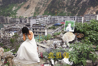 ■北川的一名女子在廢墟中擺上婚紗照,穿著婚紗哀悼死去的丈夫。 路透社